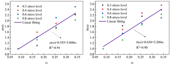 Using the parameters in Table 7, temperature-dependent coefficients a(ω) and b(ω) are determined through normalized ratios a/a(x) and b/b(x), where stress level effects a(x) and b(x) are can be calculated using Equations (4) and (5), respectively. The calculated values of a(ω) and b(ω) in Table 8 demonstrate a positive correlation with the normalized temperature level ω. Figure 11 further reveals the linear relationships between these coefficients and ω, which can be mathematically expressed as Equations (7) and (8).