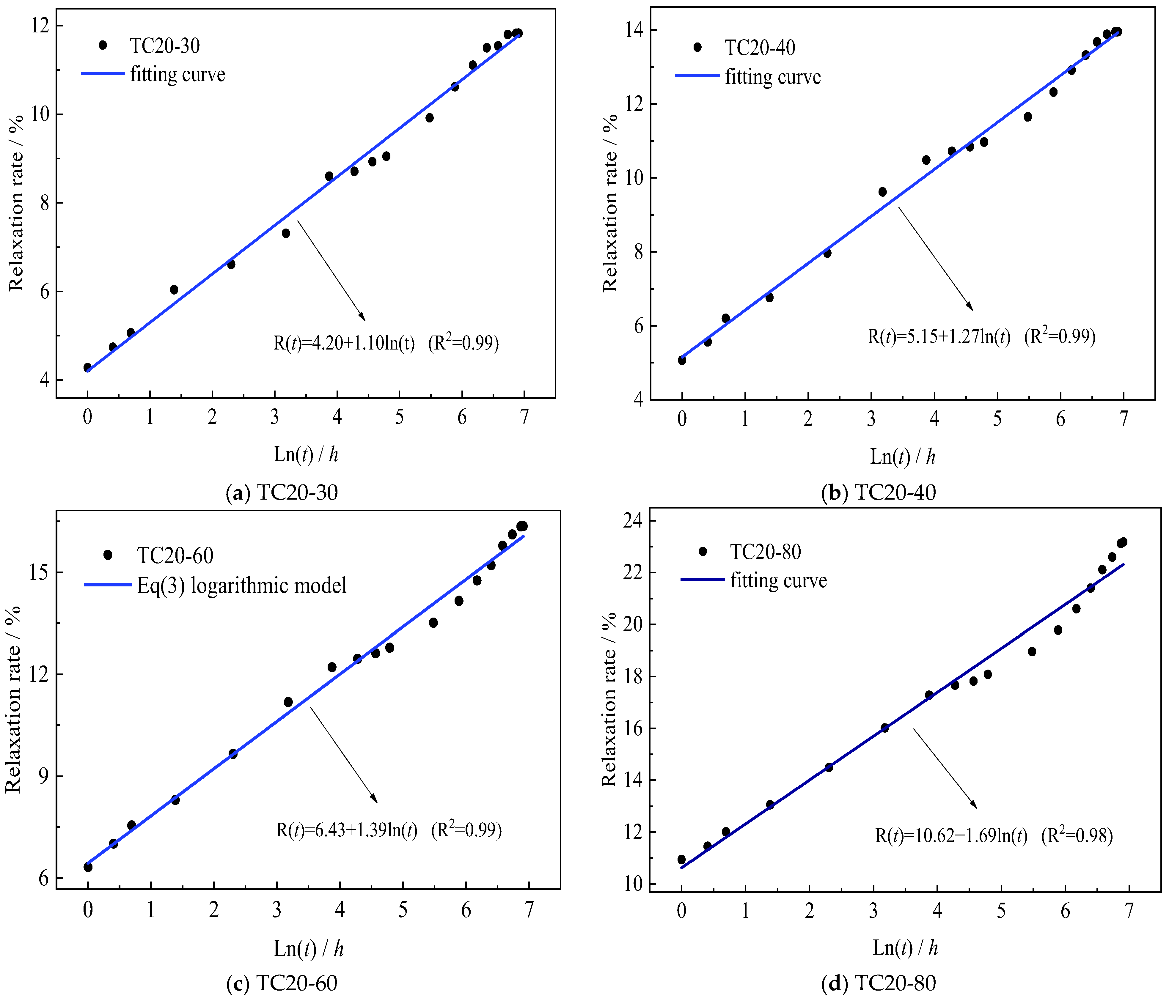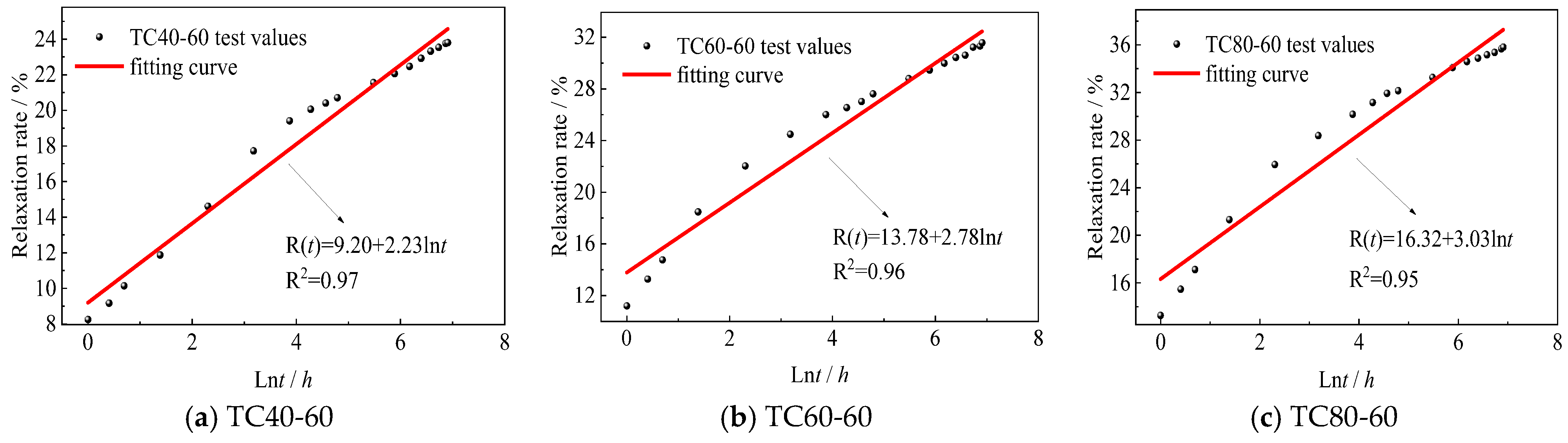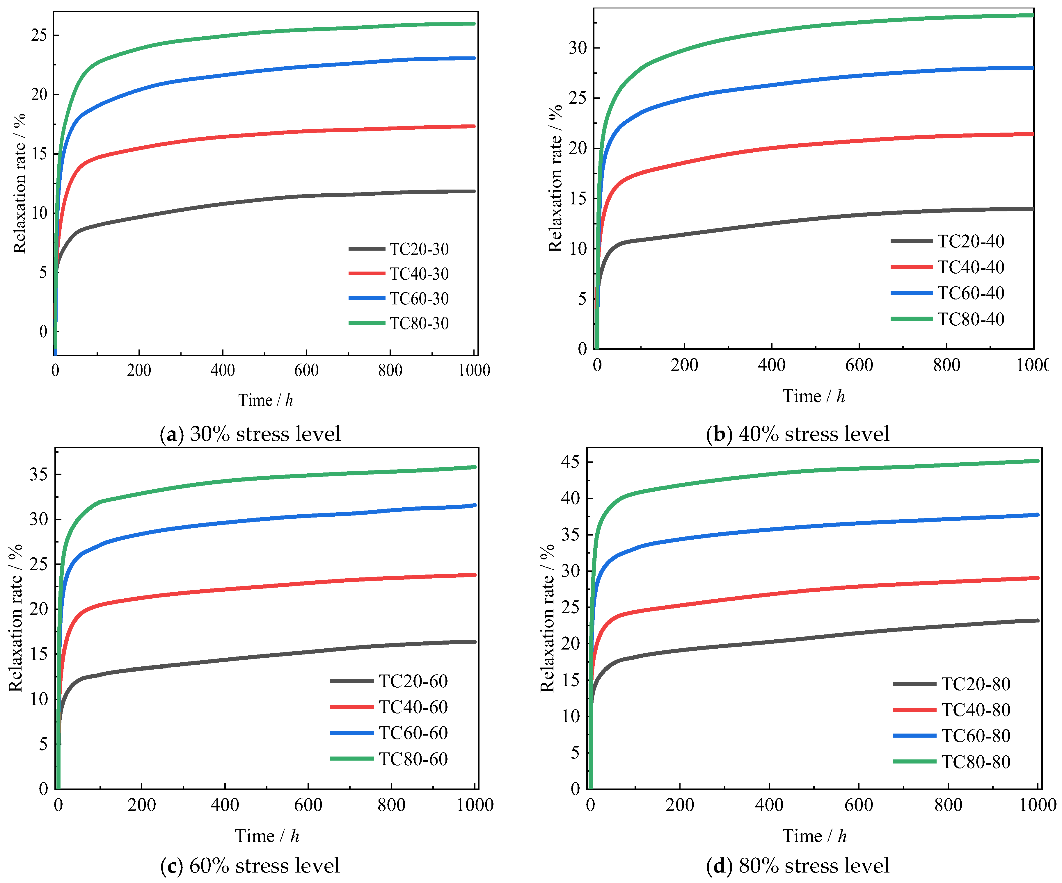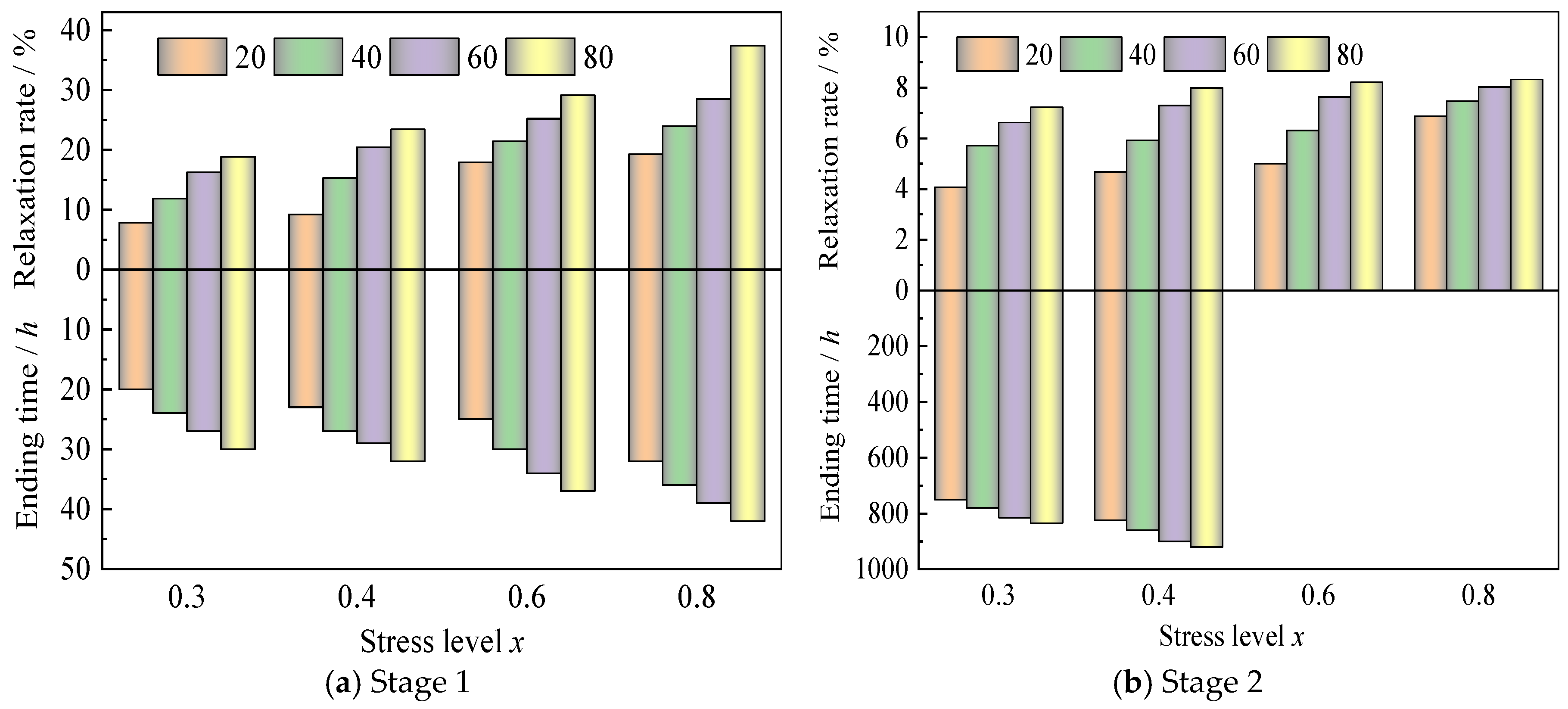 - Elevated stress levels and temperature conditions significantly enhance both the temporal duration and magnitude of first-stage relaxation. Specifically, temperature intensification prolongs secondary relaxation completion in lower stress regimes (30–40%) while amplifying relaxation extents across all loading levels. The relaxation demonstrates marked temperature sensitivity, with thermal activation mechanisms governing the relaxation rate more profoundly than mechanical stress parameters, especially for million-hour conditions.
