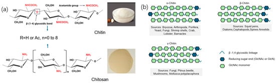 Chitin, a linear polysaccharide of β-(1→4)-linked N-acetyl-D-glucosamine, is the second most abundant biopolymer in nature after cellulose, widely distributed in arthropod exoskeletons, fungal cell walls, and microalgal frustules [,]. It has attracted considerable attention for its applications in biomedicine, agriculture, food preservation, and materials science, with functionalities ranging from drug delivery and wound healing to sustainable packaging [,,].