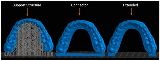 Support structures are often added to enhance adhesion to the build platform and prevent detachment during printing movements []. They also help reduce deformation and are typically placed in non-critical regions to avoid interfering with anatomical details [,,]. For instance, occlusal and adjacent soft tissue surfaces can usually be printed without direct supports, and in many cases models can be printed flat on the build platform, reducing both printing time and material consumption [].
