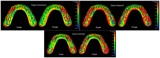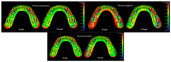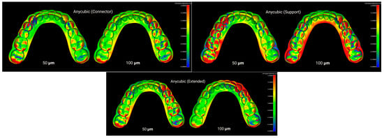 Layer heights of 50 µm and 100 µm, which are commonly applied in dental model printing, were selected. In many previous studies, root mean square (RMS) values have been used to assess dimensional deviations [,,]. While RMS provides an overall quantitative measure, it does not indicate the specific location of deviations. Therefore, in this study, point-to-surface distance calculations were additionally visualized through color-coded maps, allowing identification of the regions where deviations were most pronounced (Figure 2, Figure 3, Figure 4 and Figure 5).