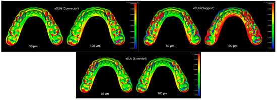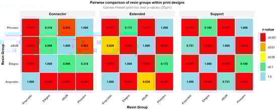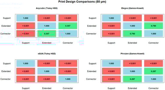 Pairwise post hoc comparisons revealed that at 50 µm layer thickness, significant differences were observed across most resin–design combinations, with Anycubic, Elegoo, and eSUN showing highly significant differences between Support vs. Extended and Support vs. Connector (p < 0.001, Tukey HSD), while Connector–Extended differences were generally not significant, except in eSUN (Table 2). For Phrozen, Extended–Support and Connector–Support were highly significant (p < 0.001, Games–Howell), whereas Connector–Extended showed no difference (Figure 10).