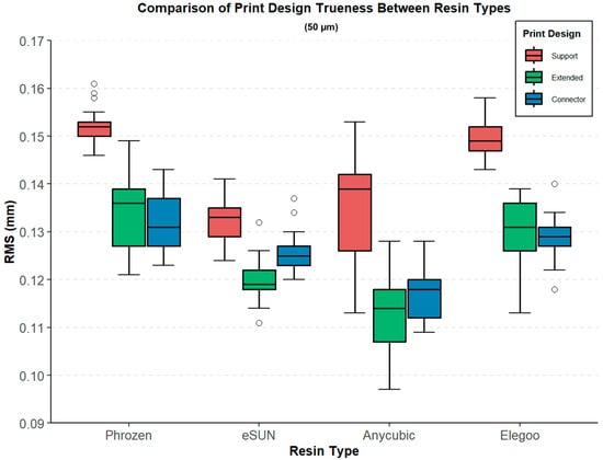 Comparison of print design trueness (RMS, mm) between different resin types (Phrozen, eSUN, Anycubic, Elegoo) at 50 µm layer thickness. Boxplots represent three print designs: support (red), extended (green), and connector (blue).