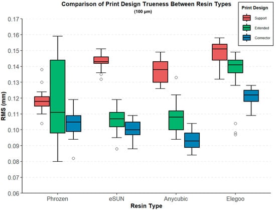 Comparison of print design trueness (RMS, mm) between different resin types (Phrozen, eSUN, Anycubic, Elegoo) at 100 µm layer thickness. Boxplots represent three print designs: support (red), extended (green), and connector (blue).