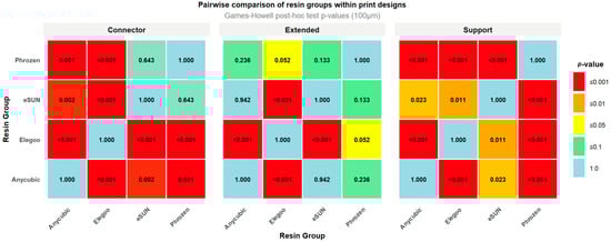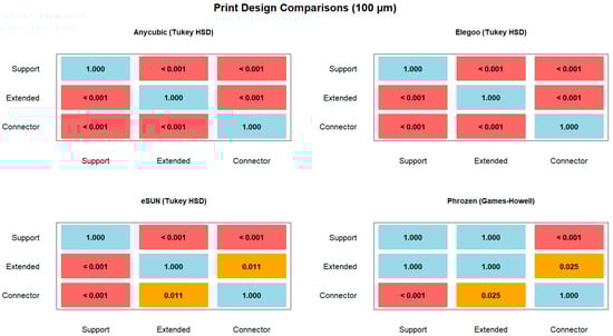 Pairwise comparisons of print designs (support, extended, connector) at 100 µm layer thickness for different resins. Post hoc tests: Tukey HSD (Anycubic, Elegoo, eSUN) and Games–Howell (Phrozen).