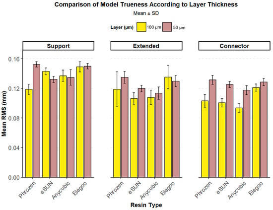 Comparison of model trueness (mean RMS ± SD) among resins at two-layer thicknesses (50 µm and 100 µm) across three print designs (Support, Extended, Connector). Yellow bars represent 100 µm and purple bars represent 50 µm layer thickness.