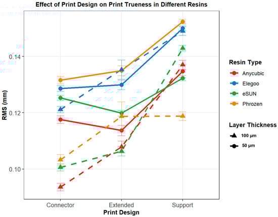 Trueness (RMS, mm) of 3D-printed models according to print design (connector, extended, support), resin type, and layer thickness. Solid lines represent 100 µm and dashed lines represent 50 µm. Error bars indicate standard error (SE).