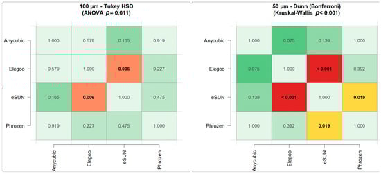 Pairwise post hoc comparisons of precision among resin groups at 100 µm (Tukey HSD, left) and 50 µm (Dunn–Bonferroni, right) layer thicknesses. Values represent pairwise p-values. Color scale indicates significance levels: green = not significant (p > 0.05), yellow = significant (p < 0.05), orange = very significant (p < 0.01), red = highly significant (p < 0.001).