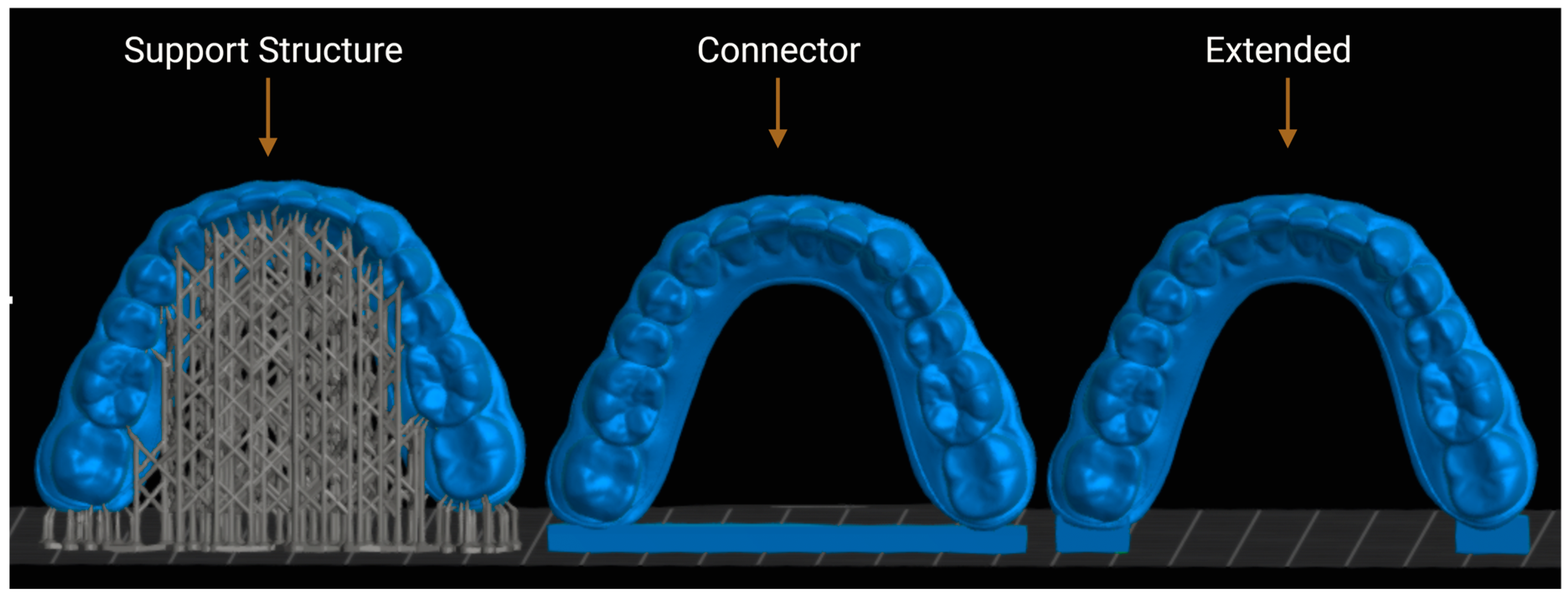 - Namano, S.; Kanazawa, M.; Qi, K.; Trang, B.N.H.; Sone, K.P.; Iwaki, M.; Komagamine, Y.; Minakuchi, S. Effects of support-structure design and postpolymerization protocols on dimensional changes in three-dimensionally printed complete dentures. J. Prosthet. Dent. 2025, 134, 190.e1–190.e9. [Google Scholar] [CrossRef] [PubMed]