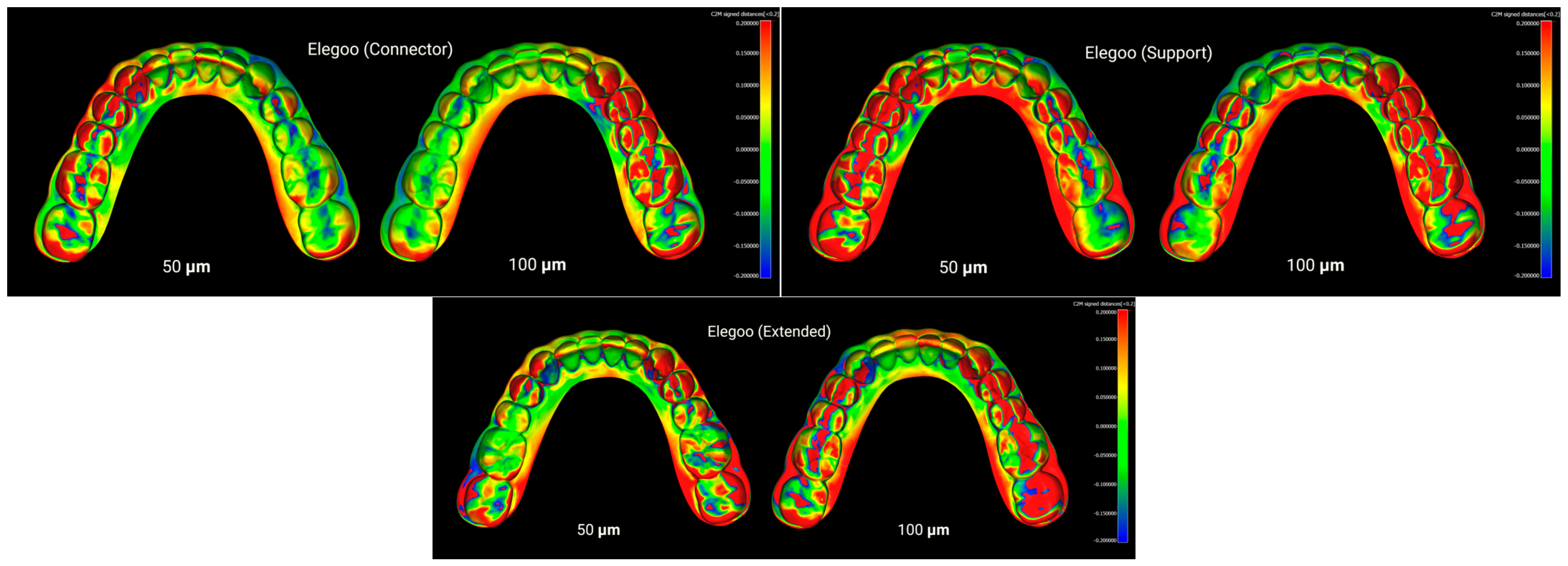 - Favero, C.S.; English, J.D.; Cozad, B.E.; Wirthlin, J.O.; Short, M.M.; Kasper, F.K. Effect of print layer height and printer type on the accuracy of 3-dimensional printed orthodontic models. Am. J. Orthod. Dentofac. Orthop. 2017, 152, 557–565. [Google Scholar] [CrossRef] [PubMed]