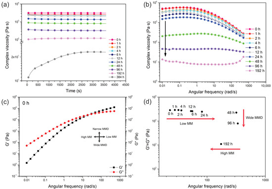- With the increase in the number of reactive species, i.e., free radicals, from stages (5) and (3), a slight increase in molar mass is observed, between 192 h and 384 h, after the abrupt decrease, between 0 and 96 h. We propose that these species begin recombining, forming branched chains of high molar mass (stage 8). This observation is supported by the increase in complex viscosity (Figure 1) and 1H-TD-Low Field NMR (Figure 2), presented in the section Rheological and 1H DQ-TDNMR analyses for the samples, as well as the decrease in the crystallinity degree, and in the section Effect of UV-C light on the molecular mobility and microstructure, and also by the increase in the CH vibration shown in the Raman spectroscopy analysis in Figure S8 in the Supplementary section.