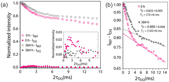 - Filgueiras, J.G.; da Silva, U.B.; Paro, G.; D’Eurydice, M.N.; Cobo, M.F.; DeAzevedo, E.R. Dipolar Filtered Magic-Sandwich-Echoes as a Tool for Probing Molecular Motions Using Time Domain NMR. J. Magn. Reson. 2017, 285, 47–54. [Google Scholar] [CrossRef]