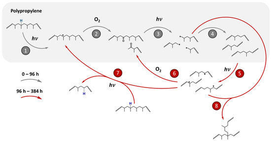 - The low molar mass chains formed in the previous stage (4) undergo homolytic bond cleavage upon photon energy absorption, leading to the formation of new radicals (stage 5), which are quickly attacked by molecular oxygen, resulting in the production of other oxidized species (stage 6). At this point, other polypropylene species contribute to the photocatalytic cycle, undergoing hydrogen abstraction by free radical molecules formed in stage (stage 7).