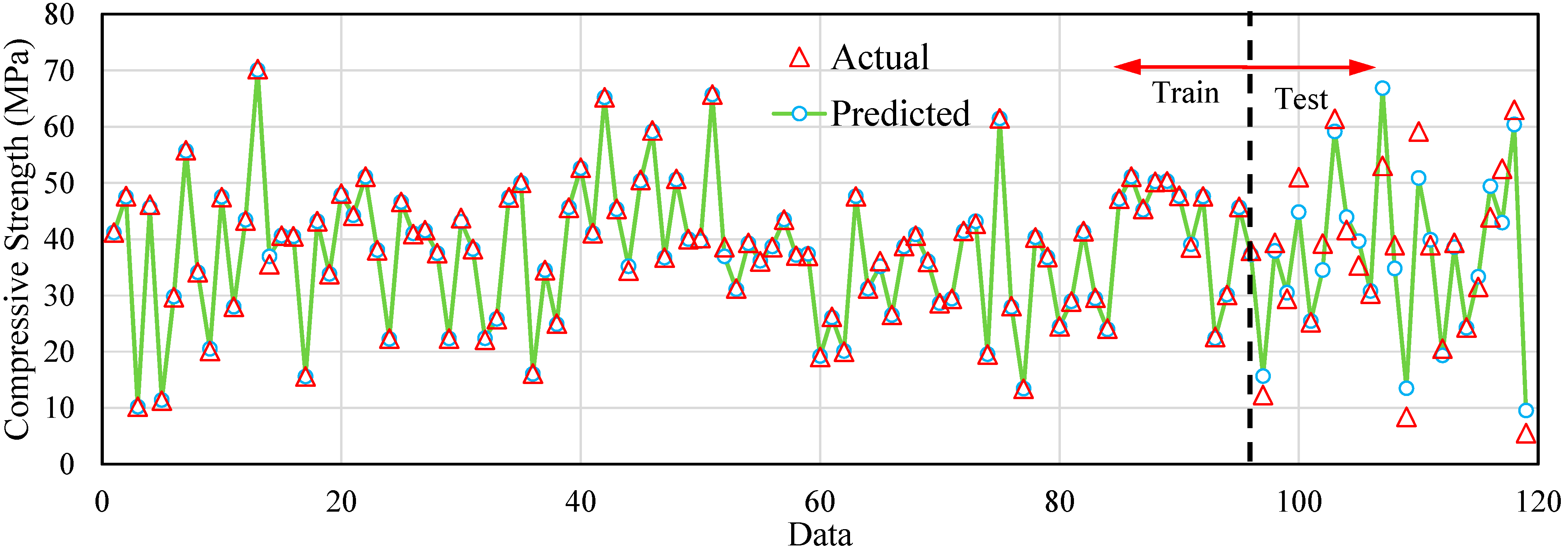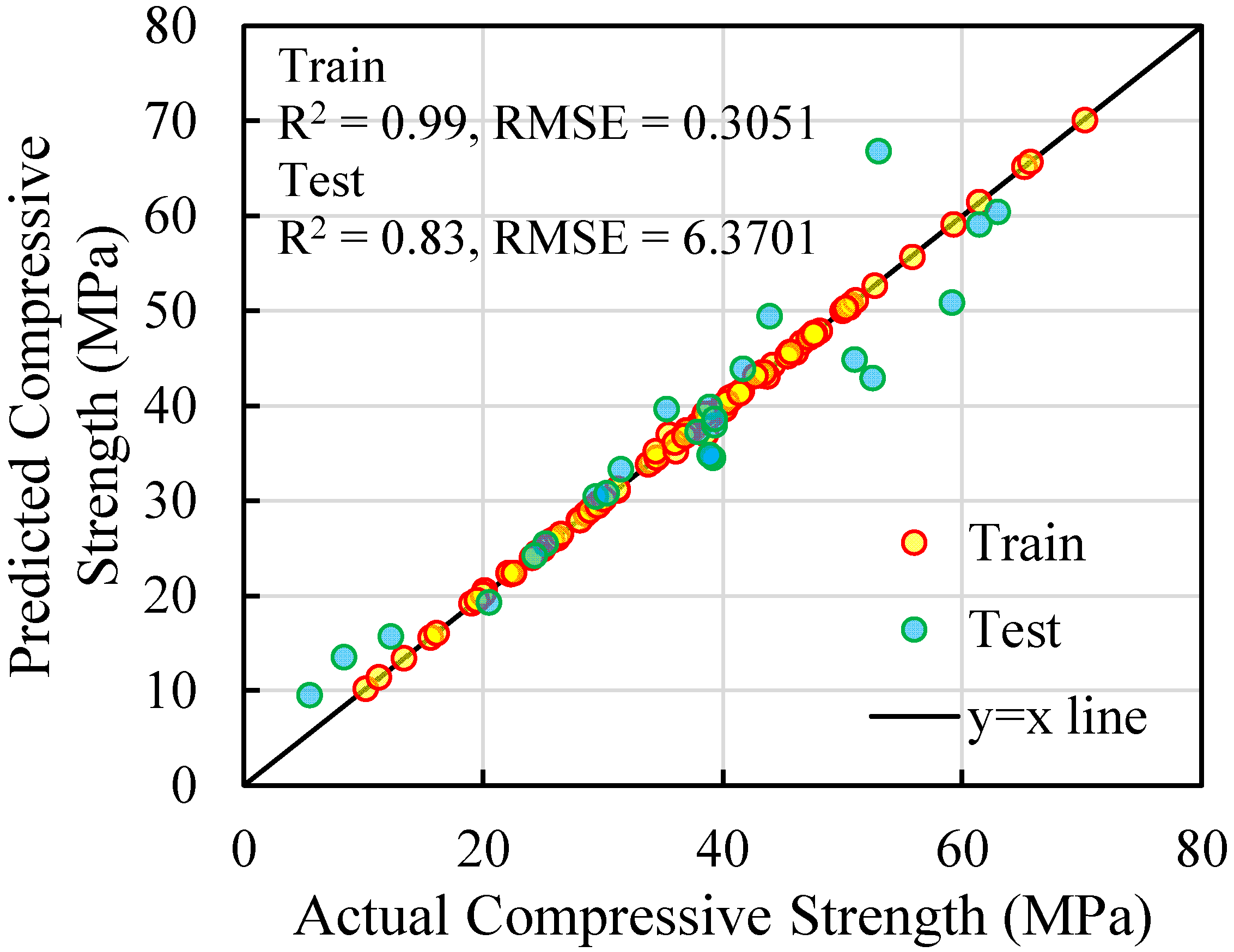 - The machine learning model, XGBoost, was developed and achieved a high predictive accuracy, evidenced by a coefficient of determination (R2) of 0.8284 and a root mean square error (RMSE) of 4.37 MPa on the test dataset.