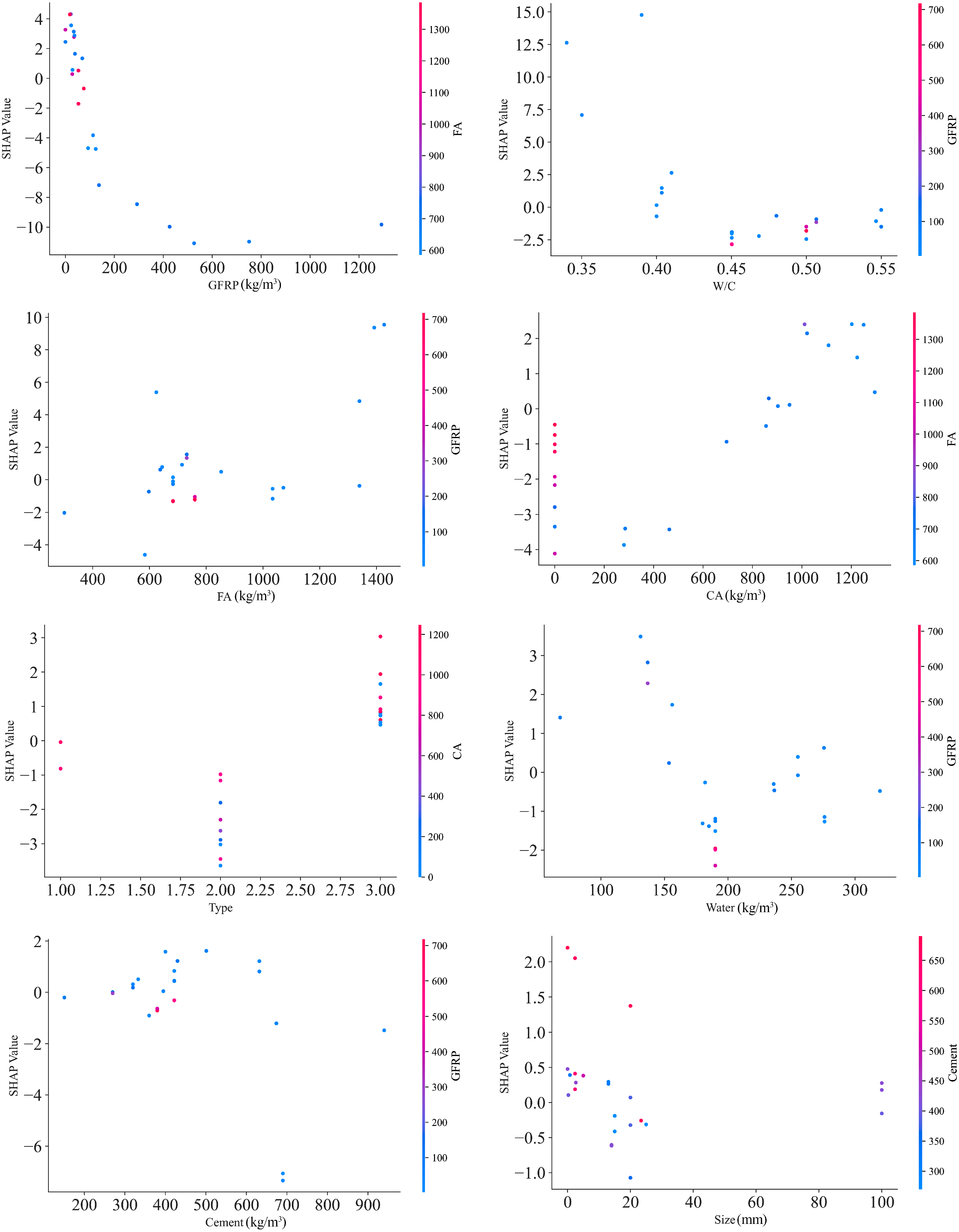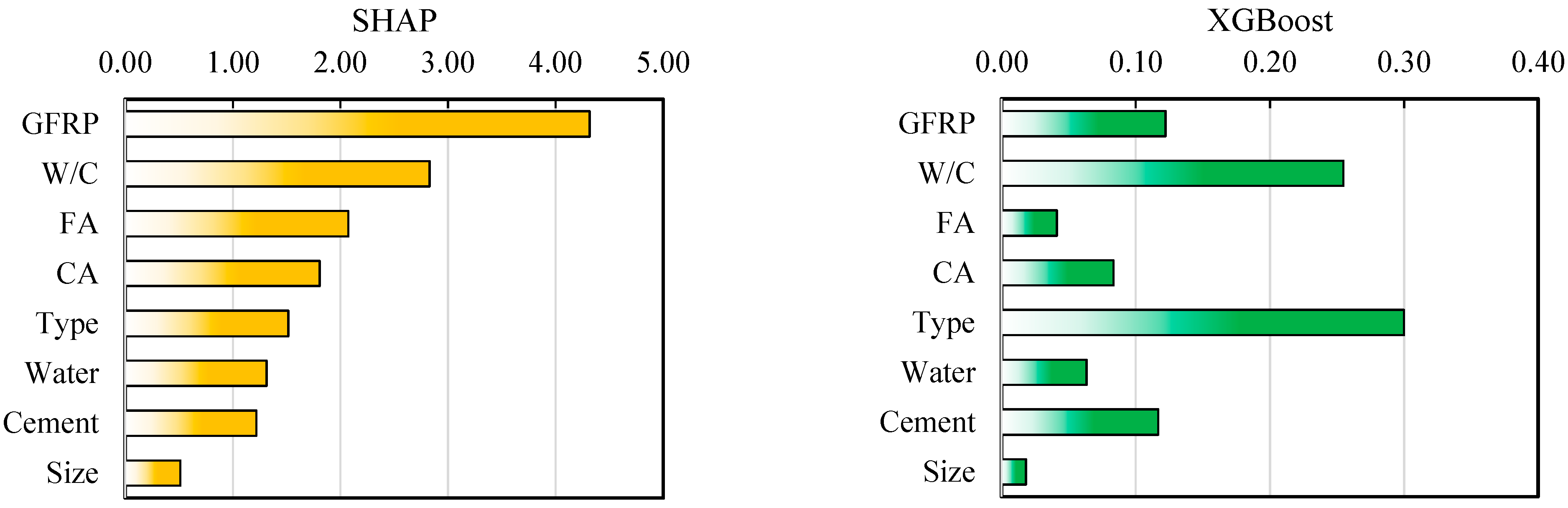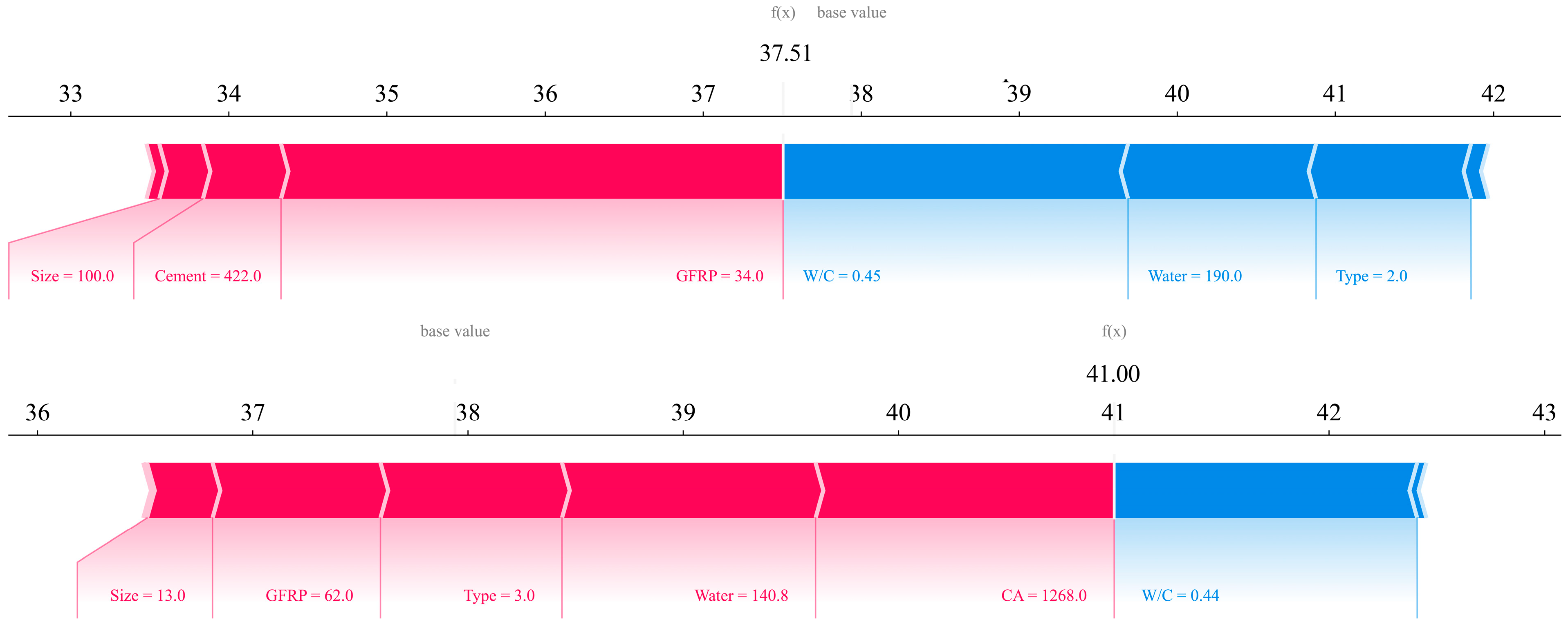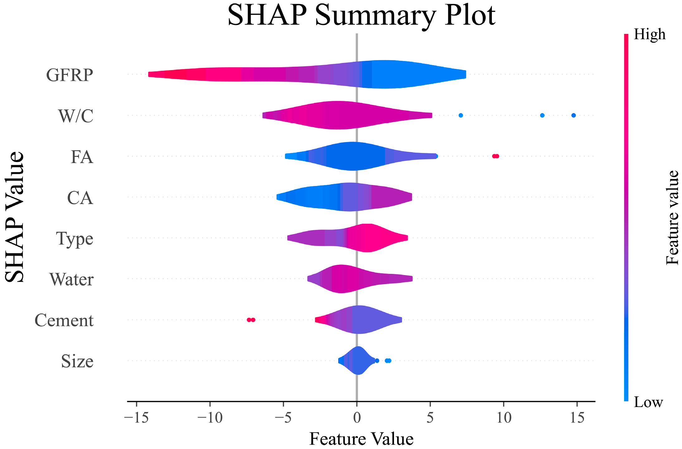 - Through SHAP analysis, the water-to-cement ratio (W/C) and the GFRP amount were quantitatively confirmed as the two most influential input parameters on the model’s output, governing the compressive strength.