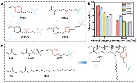 To develop temperature- and salt-resistant polyacrylamide copolymers, this study systematically screens various zwitterionic monomers with molecular structures, as shown in Figure 1a. All the zwitterionic monomers with same molar ratio were introduced into the copolymer, and then the solutions with the same concentration of this copolymer were prepared. The copolymer without zwitterionic monomers was also synthesized for comparison.