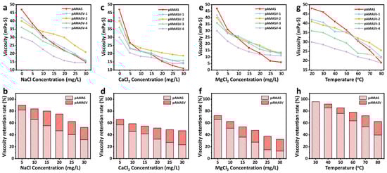 Viscosity changes and viscosity retention rate of polymer at (a,b) NaCl solution, (c,d) CaCl2 solution, (e,f), MgCl2 solution, and (g,h) different temperatures.