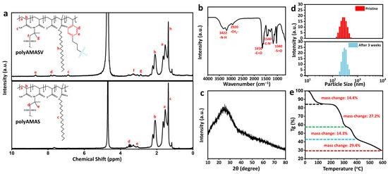 (a) 1H NMR spectra of polyAMASV and polyAMAS. (b) FTIR and (c) XRD spectra of polyAMASV. (d) The size distribution of polyAMASV. (e) TGA of polyAMASV.
