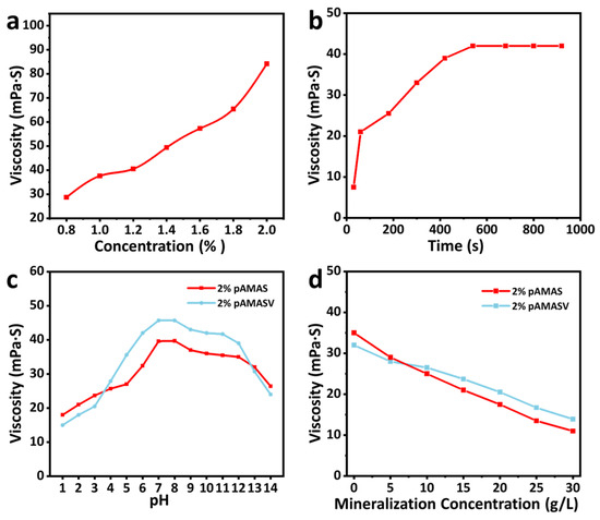 (a) Different concentrations, (b) solution time, (c) salt resistance, and (d) pH resistance of the polyAMASV solution viscosity.