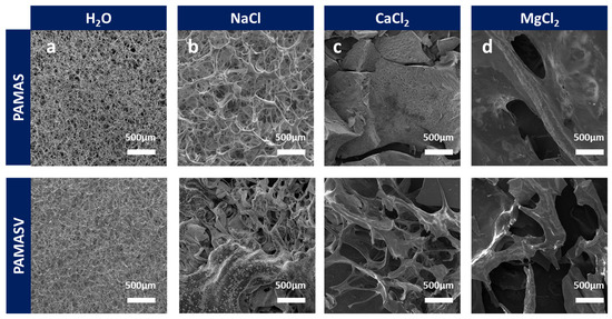 Microstructure changes in polyAMASV in (a) H2O (b) NaCl (c) CaCl2, and (d) MgCl2.