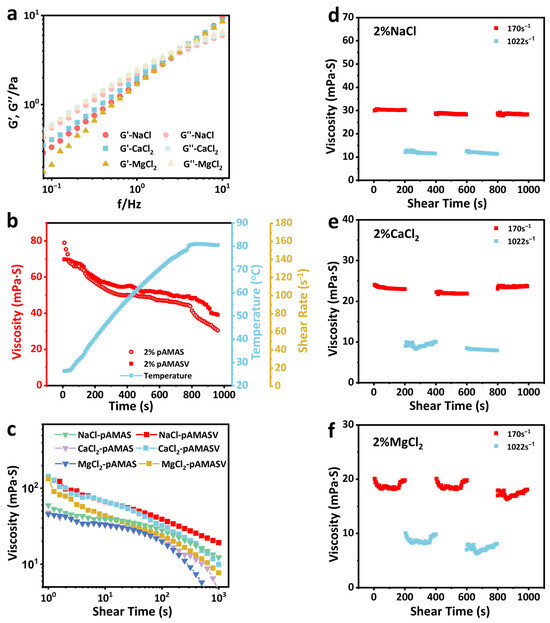 (a) Frequency scan test, (b) temperature resistance test, (c) shear resistance test in salt solution, (d) shear stability test in NaCl solution, (e) shear stability test in CaCl2 solution, and (f) shear stability test in MgCl2 solution.