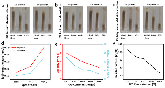 Static suspended sand test of polyAMAS and polyAMASV in (a) NaCl (b) CaCl2 (c) MgCl2 solution. (d) Sedimentation rate. (e) Viscosity and the surface tension of gel breaking fluids. (f) Residue content of gel breaking fluids.