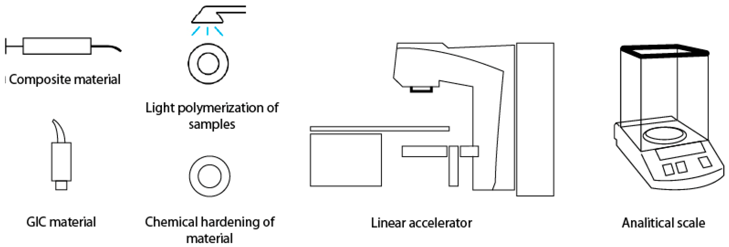 - Wanderley, E.; Lima, R.B.W.E.; De Vasconcelos, L.C.; Pontual, M.L.; Meireles, S.S.; Andrade, A.K.M.; Duarte, R.M. Effect of ionizing radiation on the properties of restorative materials. Indian J. Dent. Res. 2019, 30, 408–413. [Google Scholar] [CrossRef]