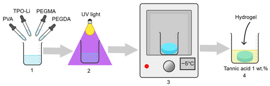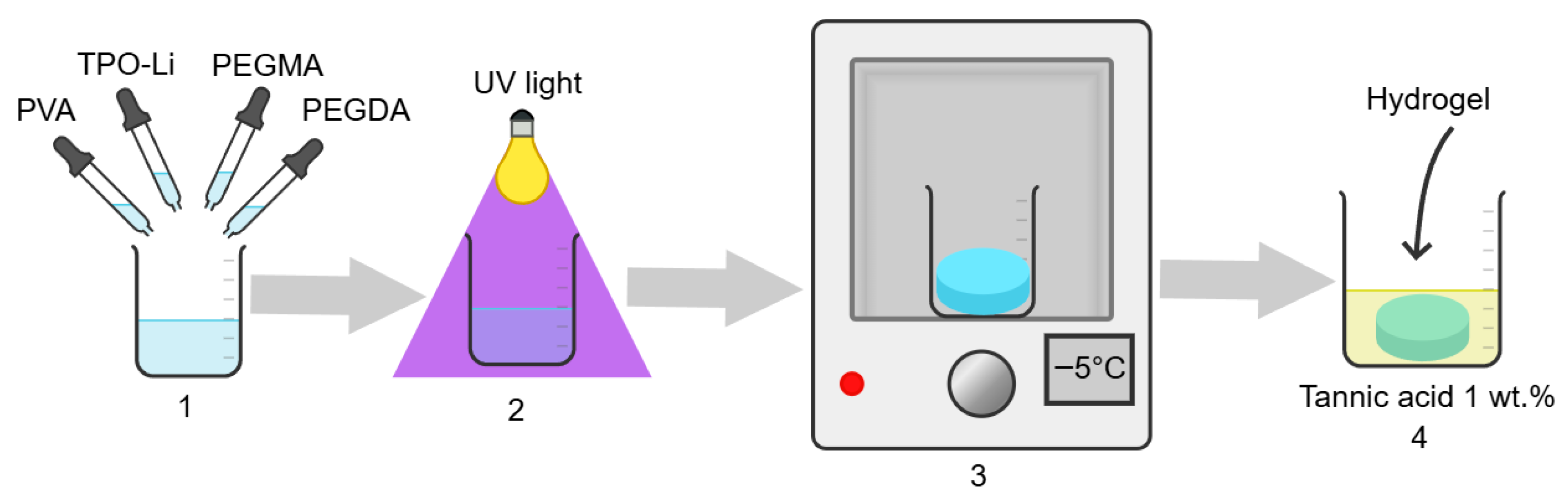 - Chen, Y.-N.; Jiao, C.; Zhao, Y.; Zhang, J.; Wang, H. Self-Assembled Polyvinyl Alcohol–Tannic Acid Hydrogels with Diverse Microstructures and Good Mechanical Properties. ACS Omega 2018, 3, 11788–11795. [Google Scholar] [CrossRef]