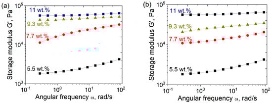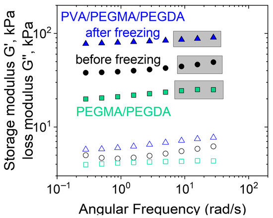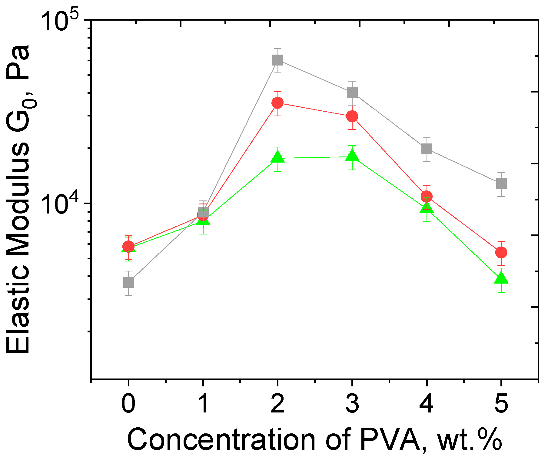 - Narita, T.; Mayumi, K.; Ducouret, G.; Hébraud, P. Viscoelastic Properties of Poly(Vinyl Alcohol) Hydrogels Having Permanent and Transient Cross-Links Studied by Microrheology, Classical Rheometry, and Dynamic Light Scattering. Macromolecules 2013, 46, 4174–4183. [Google Scholar] [CrossRef]
