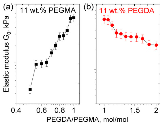 - Beamish, J.A.; Zhu, J.; Kottke-Marchant, K.; Marchant, R.E. The Effects of Monoacrylated Poly(Ethylene Glycol) on the Properties of Poly(Ethylene Glycol) Diacrylate Hydrogels Used for Tissue Engineering. J. Biomed. Mater. Res. A 2010, 92A, 441–450. [Google Scholar] [CrossRef]
