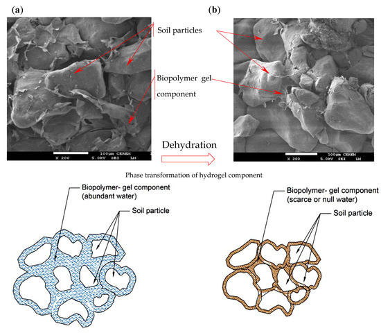 - At the highest level of dehydration (high suction), the biopolymer gel components strengthened interparticle bonding. The phase change from hydrogel to films was supported by SEM images, and the enhancement of the cross-linking phenomenon generated tensile strength and improved resilience characteristics.