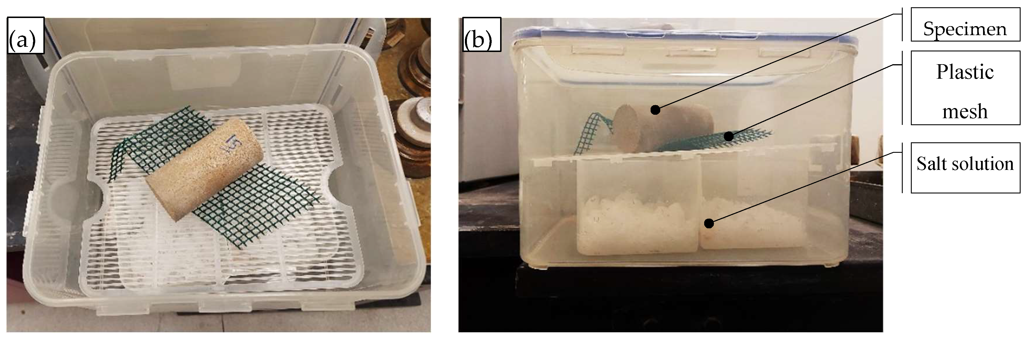 Several isolated boxes were prepared for each solution. Each specimen was suspended in non-contact with the salt solution using a plastic mesh, as shown in Figure 4a, and the entire setup was placed inside an airtight box (Figure 4b) to achieve equilibrium.