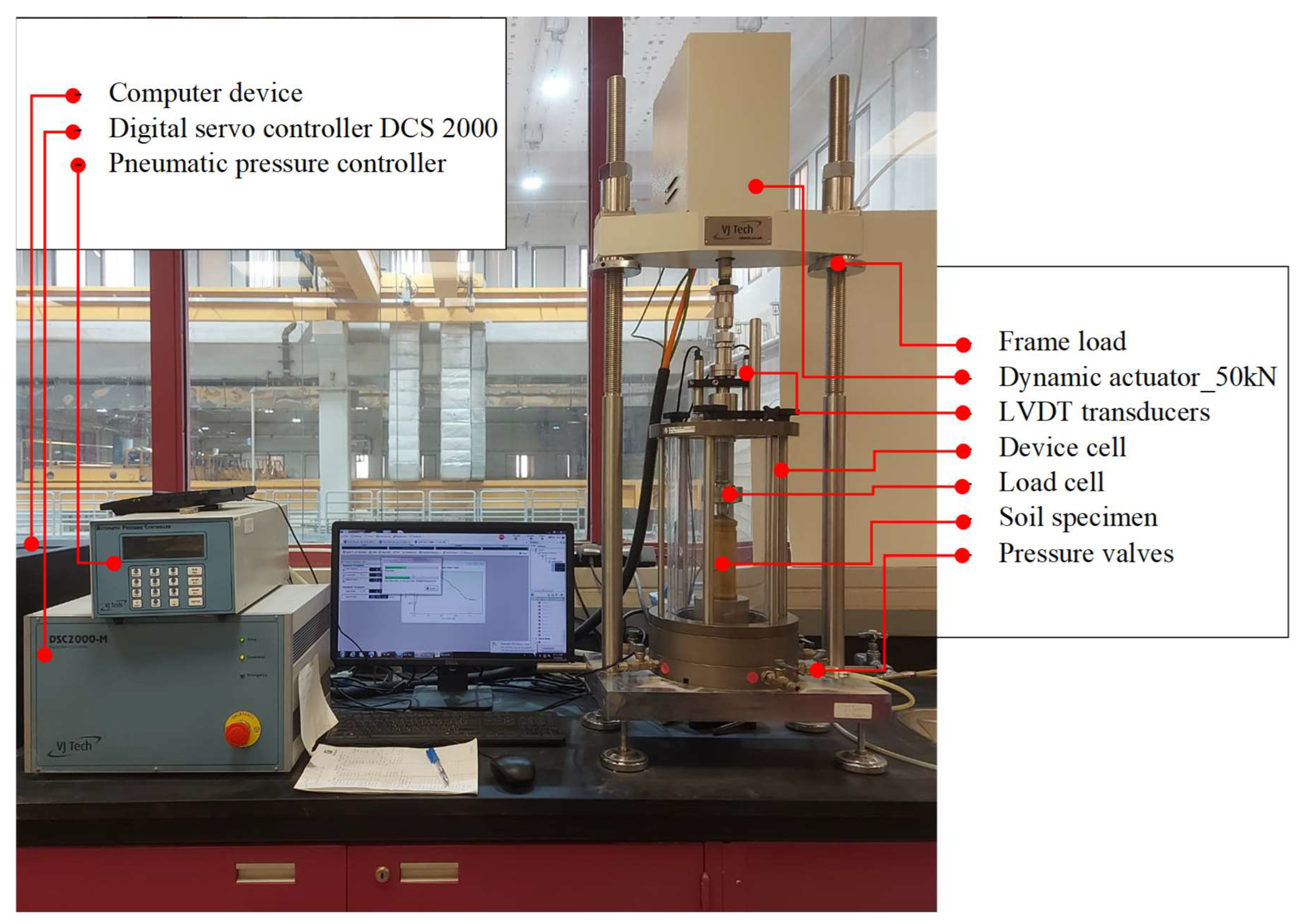 The resilient modulus (i.e., MR) defines the relationship between the stress and strain responses of soil under cyclic loading conditions. This loading was stimulated by the expected repeated loads of traffic: several axial stresses (AS) were applied under different confining stresses of 13.8 kPa, 27.8 kPa, and 41.4 kPa as per AASHTO T-307 [52]. A dynamic triaxial system provided by VJ Tech® (Reading, UK) was used to conduct the tests. The entire system is illustrated in Figure 7, where the main components are also highlighted. The setup was connected and operated by appropriate software connected to a computer. The tests were conducted in the laboratory on tread specimens after curing. The specimen was encased in a rubber membrane inside a device cell to facilitate the application of the confining stress. The test was conducted using a triaxial dynamic system by an automated, closed-loop servo electromechanical loading system (VJ Tech®, Reading, UK) (Figure 7). The shape of the applied cycle was haversine with a duration of 0.1 s and a rest period of 0.9 s. As previously mentioned, the actuator was applied with successive cycles at this rate, and a pneumatic air pressure controller was used to apply the confining stresses. An attached load cell and linear variable differential transformers (LVDTs) were used to record the applied stresses on the specimen and the corresponding deformation. The deformation was considered the average value obtained from the two transducers.
