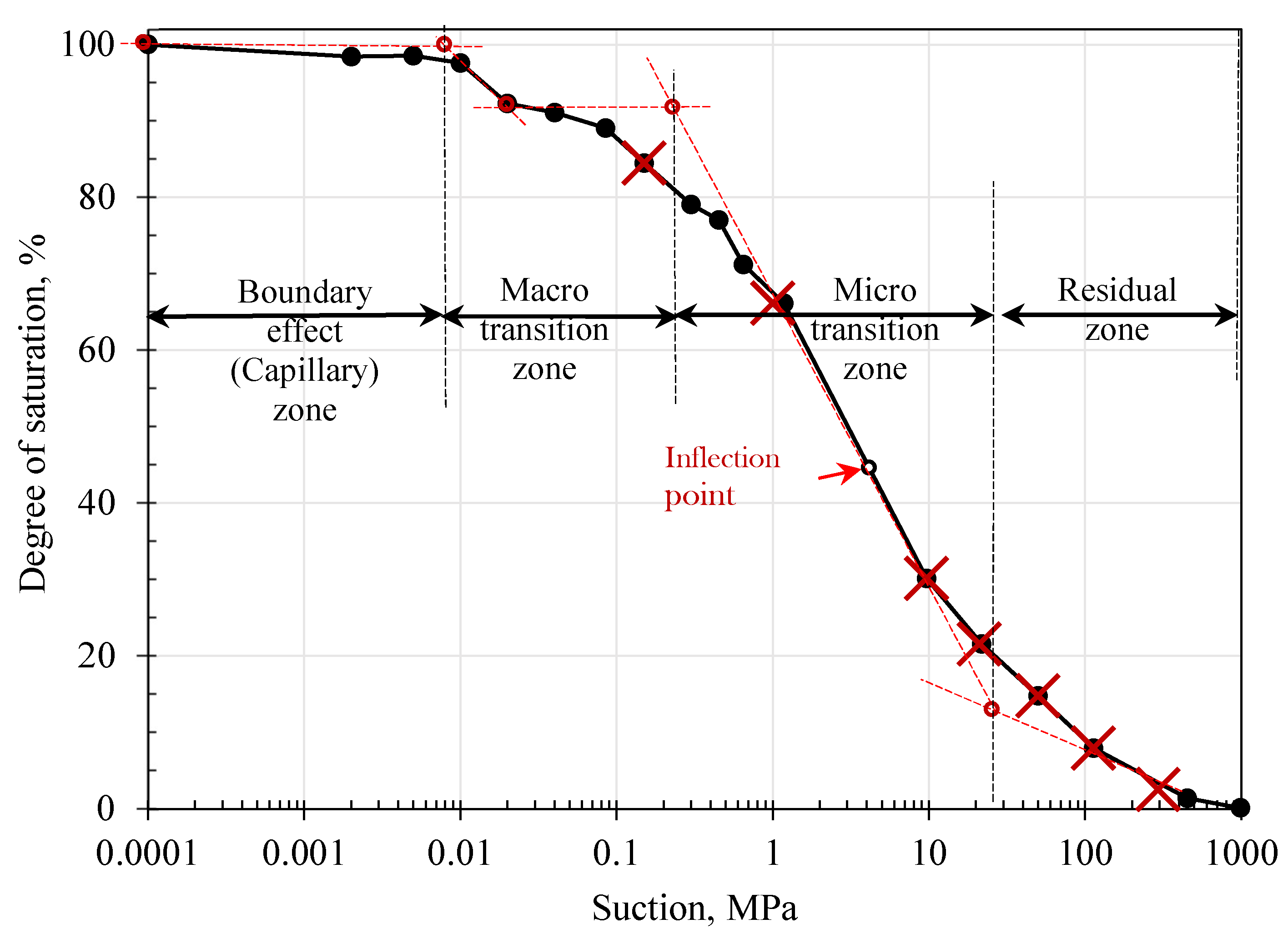 The behavior of soil under any dehydration level can be better interpreted in relation to these zones, and it is essential to consider the modeling and design parameters in the unsaturated state. In Figure 8, the red crosses refer to the selected points for the DC in different zones. Hereafter, the MR test point is interpreted and linked to these zones and their levels of suction.