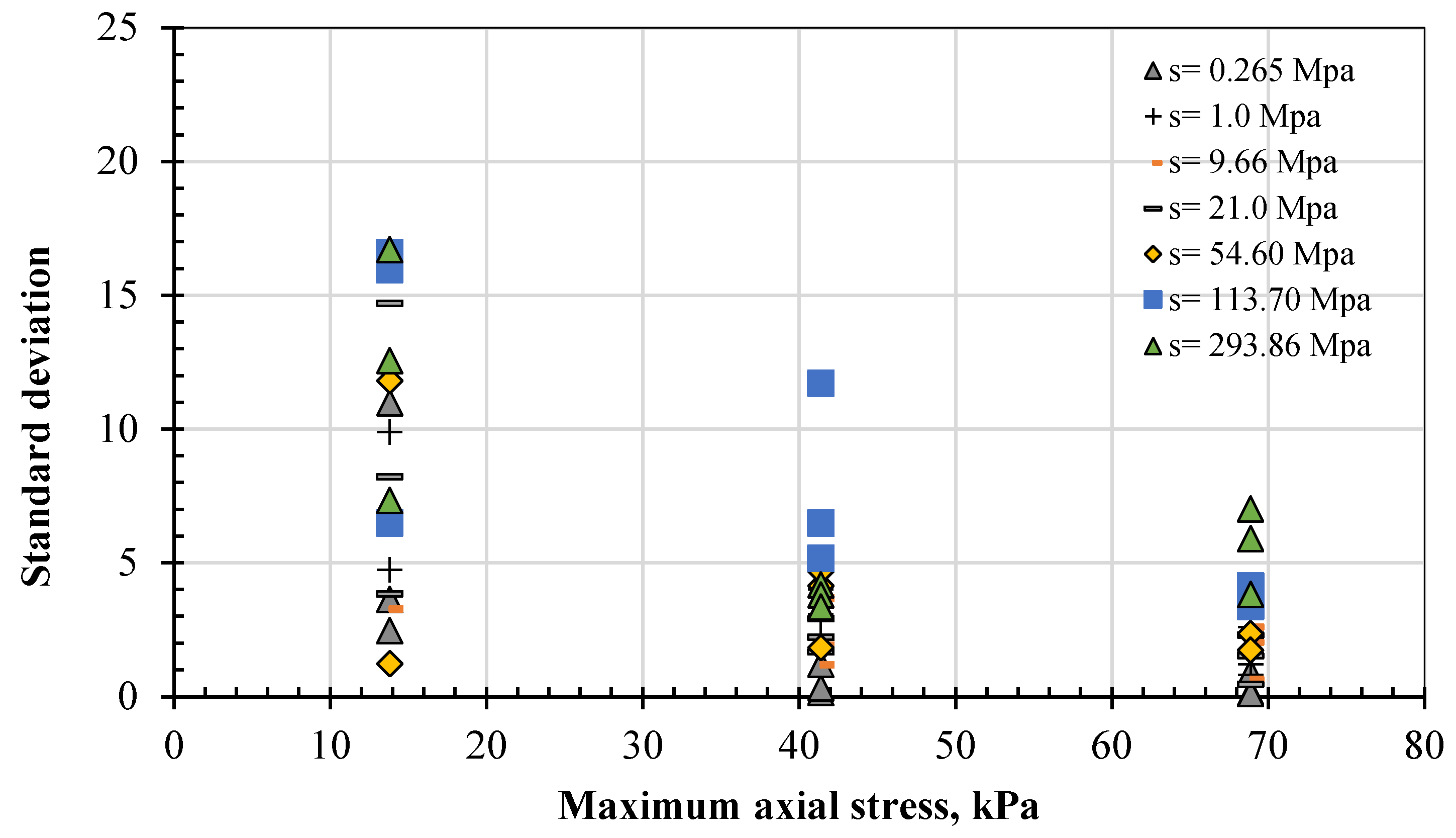 This test involved a large number of repetitions, which enhances reliability: 15 sequences of the load stage were conducted in addition to the initial conditioning stage (sequence 0). The initial conditional sequence comprised 500 cycles, and each of the other sequences comprised 100 cycles. The values presented in the results represent the average of the last five cycles for each sequence, as advised by AASHTO T 307 [52]. The standard deviations associated with these values for the specimens tested under DH curing (i.e., 7 specimens) are shown in Figure 9. Except for the first or initial states at the lower maximum axial stress, the standard deviation varied from a low value of 0.142 and was mostly limited to 5. The maximum and minimum values were 45 and 421, respectively, and the median value for this range was 252.