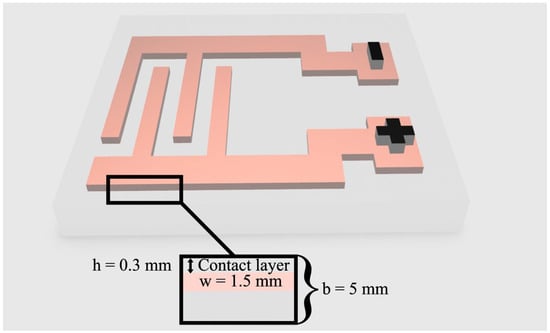 The electroadhesive was an interdigital electrode with a thickness (w) of 1.5 mm inside a dielectric (Figure 1). Thermosetting polyurethane (NOACAST 700, Composit-stroy, Moscow, Russia) was used as a dielectric. The thickness of the contact layer (h) was 300 μm. The total thickness of the electroadhesive (b) was 5 mm.