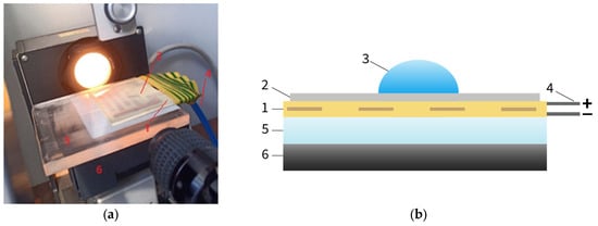 Stand for determining free surface energy by the sessile drop method (a) and experimental scheme (b): 1—electroadhesive; 2—substrate (polymer film); 3—drop of test liquid; 4—leads of electroadhesive; 5—insulating plate made of organic glass; 6—microscope stage.