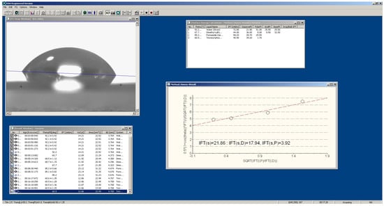 According to the scheme shown in Figure 2b, the electroadhesive (1) was glued with double-sided tape to an insulating plate made of organic glass (5). The polymer film (2) was placed on the electroadhesive (1) and electric voltage was applied to the electroadhesive (1) through conductors (4). A drop of test liquid (3) was applied to the polymer film (2) and the contact angle of wetting for four test liquids was recorded using a horizontal microscope equipped with an angle measurement scale. The free surface energy and its components were calculated using the Owens-Wendt equation in the DSA1 software application (v. 1.29.1.1) (Figure 3).