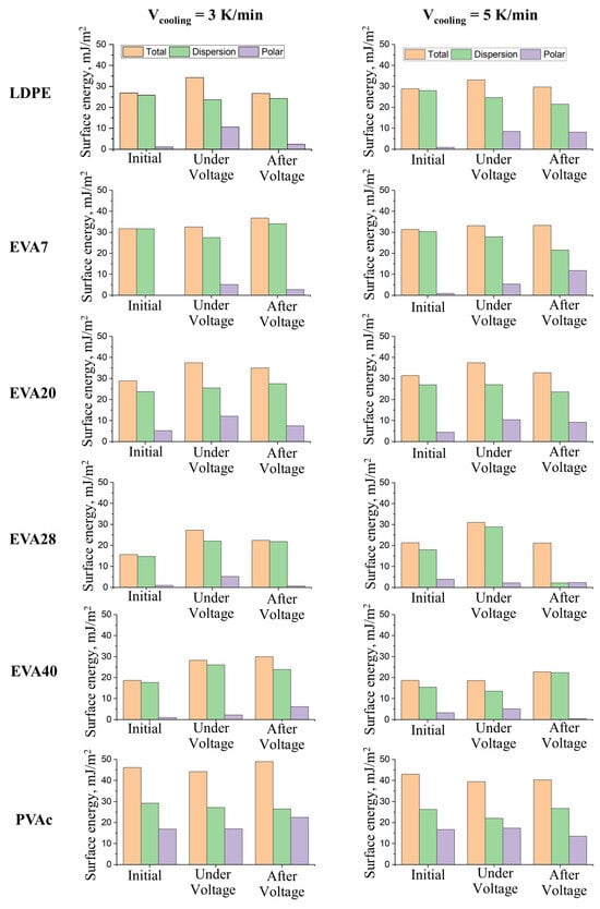 Change in surface energy and its components under the influence of an electric field (U = 4 kV) and 10 s after its removal on films with different degrees of crystallinity: LDPE, EVA7, EVA20, EVA28, EVA40 and PVAc.