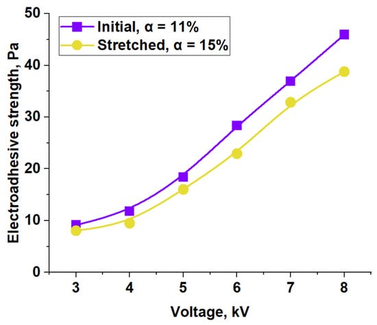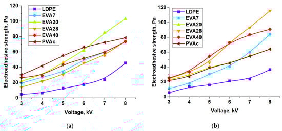 The contactless method was used to determine the forces of electroadhesive interaction along the normal after 100 s of two adhesive pairs being under voltages from 3 to 8 kV. The obtained data are presented in Figure 12 as a dependence of the electroadhesive strength of the joint on voltage. Note that the error in the obtained values did not exceed 5%, which corresponds to the confidence interval limited by the size of the marker point.