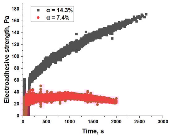 Kinetics of change in electroadhesive strength at a voltage of 5 kV in a system with EVA40 with a degree of crystallinity of 7.4 (red) and 14.3% (black).