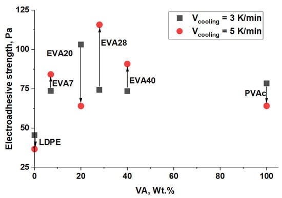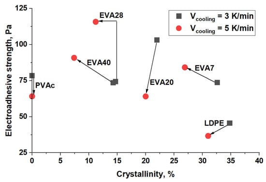 Figure 9 presents the generalized data on the influence of EVA, characterized by different values of the degree of crystallinity, on the electroadhesive strength after 100 s of charging under a voltage of 8 kV. It is evident that with such a short-term effect of the electric field on the adhesive system, despite the fact that the annealed amorphous-crystalline samples are characterized by a lower degree of crystallinity, the changes in the electroadhesive interactions are close to chaotic. The differences, as shown in Figure 8, appear at longer charging times of the adhesive system.
