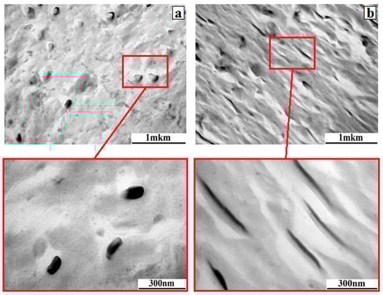 TEM images of the initial sample of EVA28 with α = 11% (a) and oriented with α = 15% (b). The figures below show characteristic enlarged areas illustrating changes in the phase structure of the samples as a result of orientation processes.