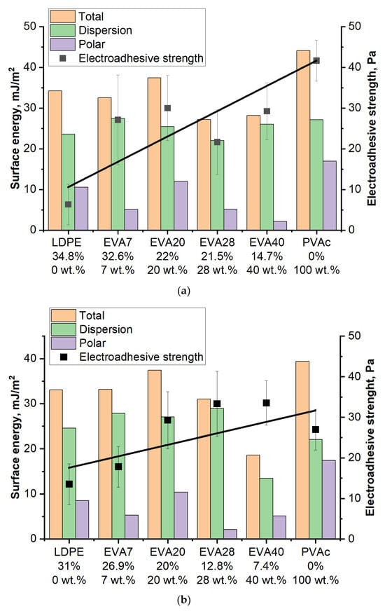 In the case of films with both low and high crystallization rates (Figure 13), the electroadhesive strength at a voltage of 4 kV increases with an increase in the concentration of vinyl acetate in the material and a decrease in the degree of its crystallinity. A correlation is also observed between the value of the surface energy and the value of the electroadhesive strength. The LDPE sample is an exception. Its low electroadhesive strength is primarily due to the low polar component of the surface energy, caused by the zero concentration of vinyl acetate. With an increase in the concentration of polar groups and a decrease in the degree of crystallinity, an increase in the electroadhesive strength of the systems is observed.