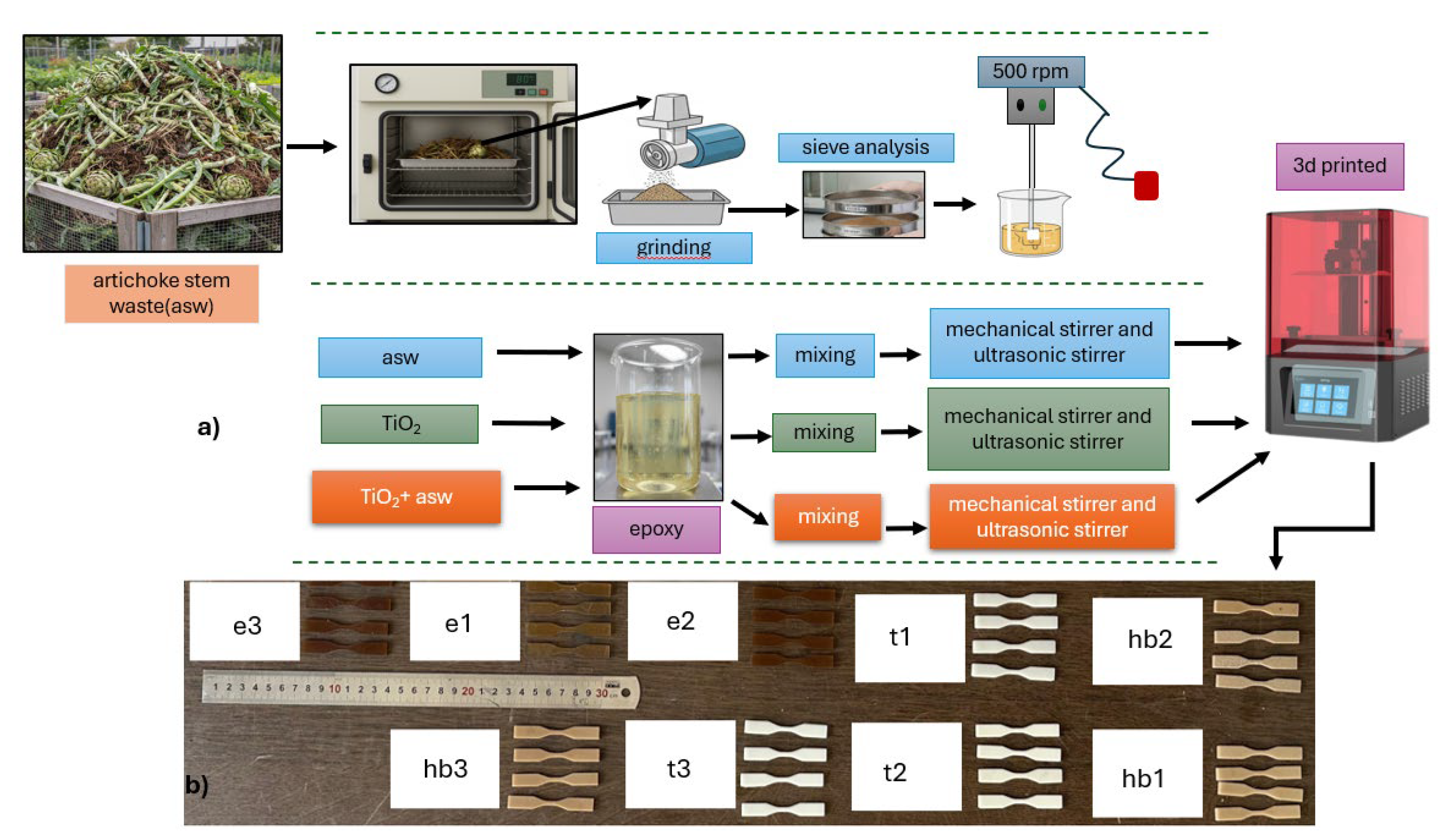 Epoxy resin (AnyCubic Technology Co., Ltd., Hong Kong/China) was obtained from a commercial source. ASW was sourced from local agricultural providers. The unprocessed artichoke stems were meticulously cleansed to eliminate contaminants, dehydrated in an oven at 80 °C for 24 h, and subsequently pulverized into a fine powder utilizing a blade mill. The resultant powder was sieved by using 200 mesh (75 µm) stainless steel sieve, and particles less than 75 microns were utilized for composite fabrication. Nano titanium dioxide (TiO2) powder, with average particle size of 25–35 nm, density of approximately 4.23 g/cm3, and purity of 99.5 (Nanokar Kimyevi Maddeler San. ve Tic. Ltd. Şti., Istanbul/Türkiye), was acquired through commercial means.