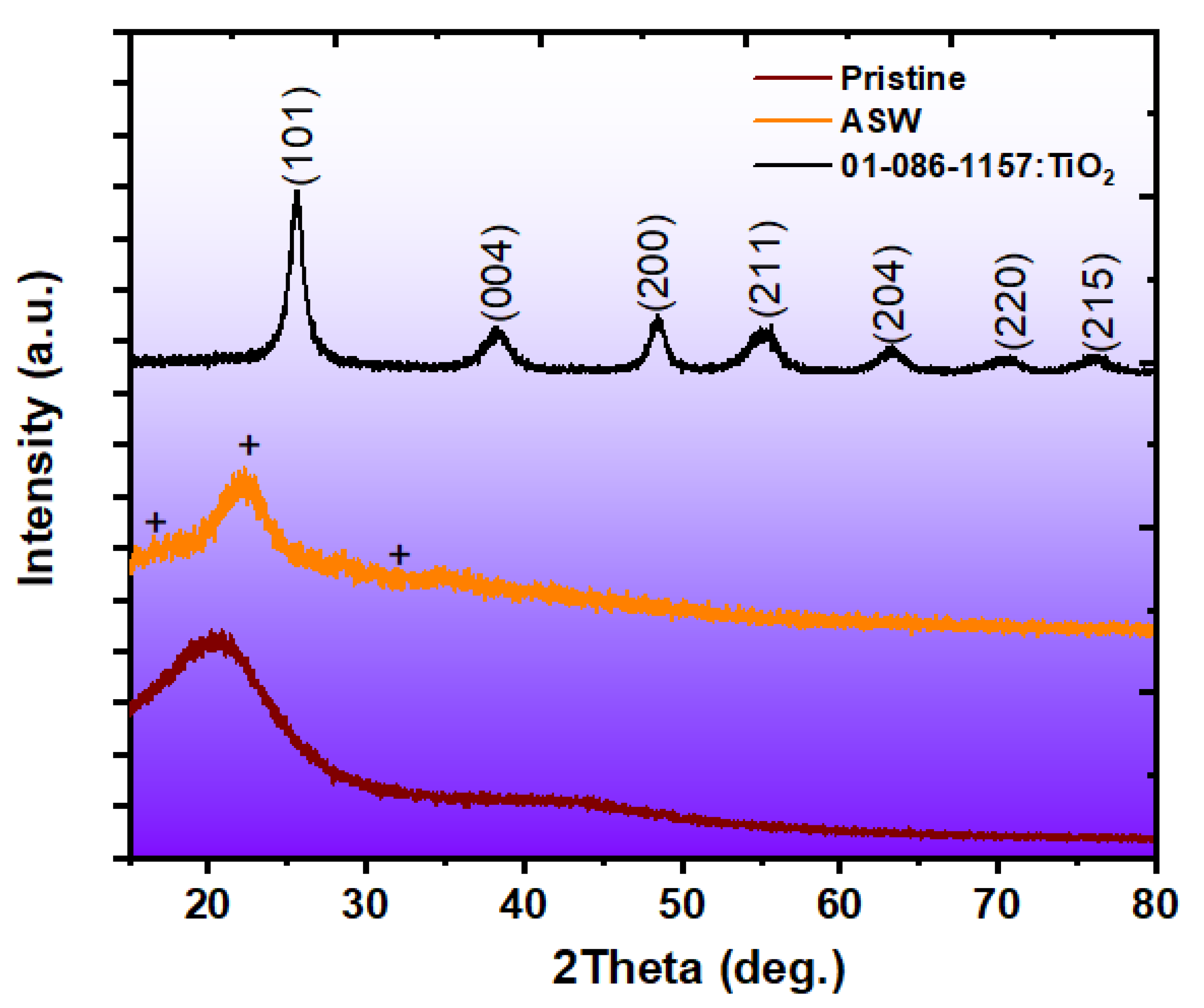 Figure 2 shows the X-ray Diffraction (XRD) patterns of the pristine (cured epoxy resin), ASW, and TiO2 NP samples. The pristine samples exhibit a broad amorphous hump centered around 20–25° (2θ), indicating the absence of long-range crystalline order that is typical of crosslinked thermoset polymers.