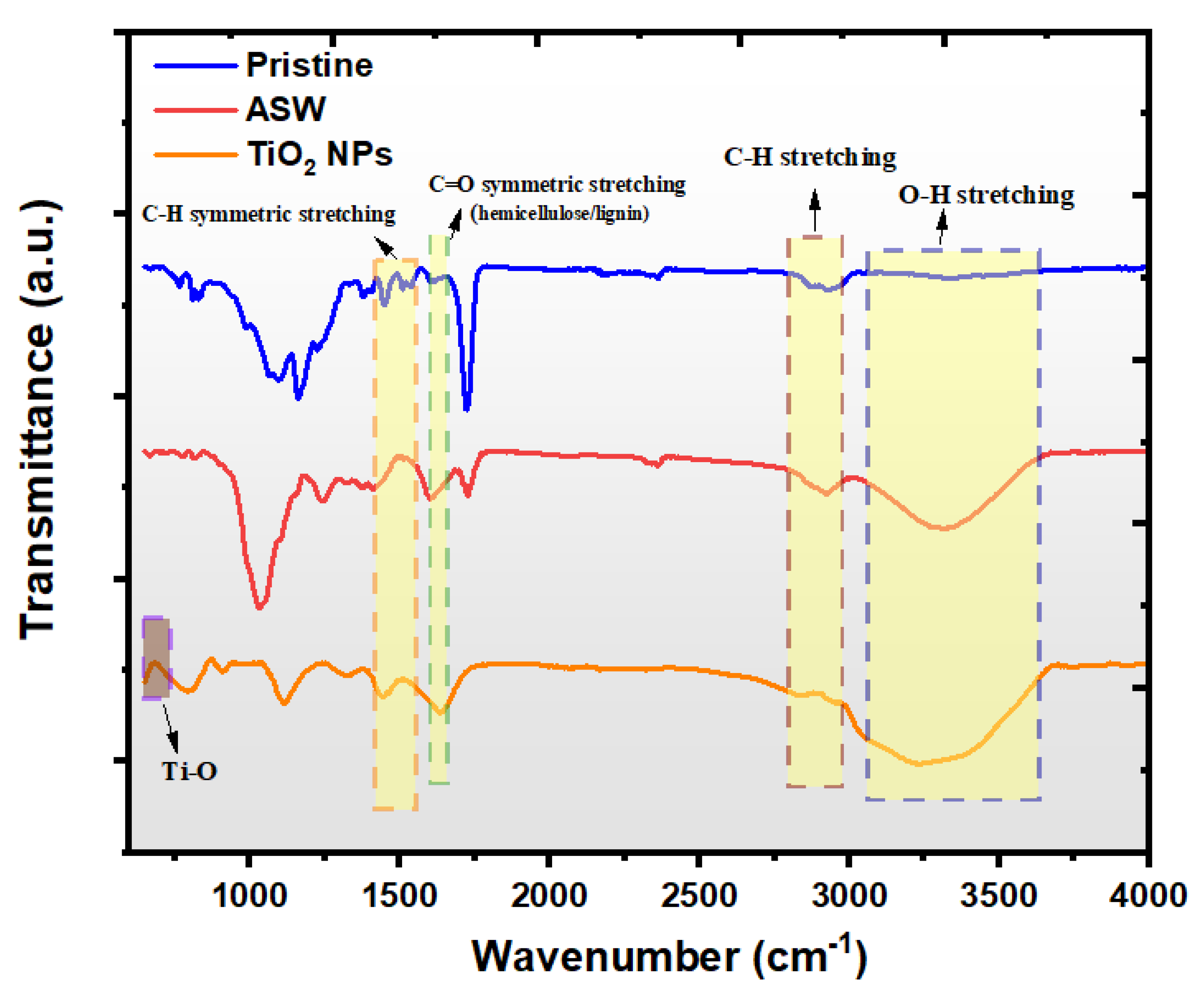 Figure 3 presents the Fourier Transform Infrared (FT-IR) spectra of raw materials, providing detailed information about the chemical functional groups and molecular structure of the pristine (cured epoxy), ASW, and TiO2 NP samples. For the ASW component, the broad absorption band in the region of 3200–3400 cm−1 is attributed to O-H stretching vibrations from hydroxyl groups present in cellulose, hemicellulose, and lignin components [37]. The absorption bands observed in the 2850–3000 cm−1 region correspond to C-H stretching vibrations from methyl and methylene groups present throughout the lignocellulosic structure [38]. The peak at approximately 1730 cm−1 is assigned to C=O stretching vibrations from acetyl groups in hemicellulose and ester linkages in lignin. For the TiO2 nanoparticles, the characteristic absorption band in the nearly 500–700 cm−1 region corresponds to Ti-O lattice vibrations, confirming the presence of the titanium dioxide phase.