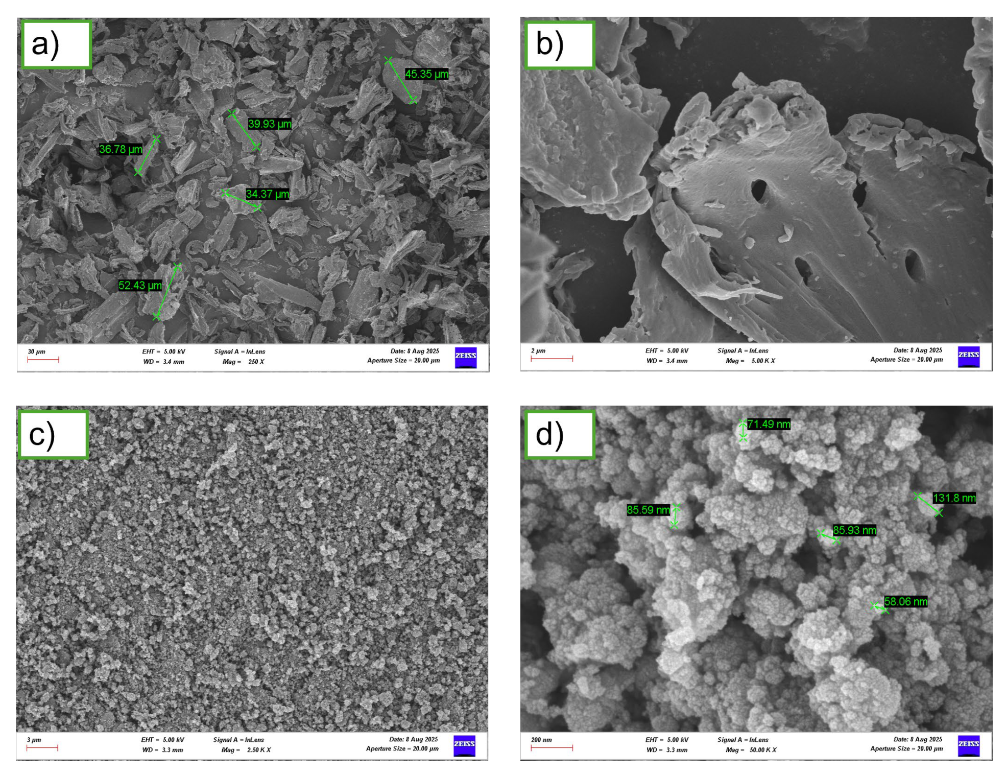 Figure 4 displays SEM images of ASW and TiO2 NPs micrographs that enable a comprehensive morphological characterization of the reinforcing phases, elucidating their size distribution, surface properties, and potential for mechanical interlocking within the composite matrix. Figure 4a,b illustrate the morphological features of ASW particles, revealing the characteristic fibrous and heterogeneous structure typical of lignocellulosic materials [39]. These particles display variable forms with rough, textured surfaces, which are advantageous for mechanical interaction with the polymer matrix [40] The reported particle sizes, between 30 and 60 μm, are within an ideal range for composite reinforcement.