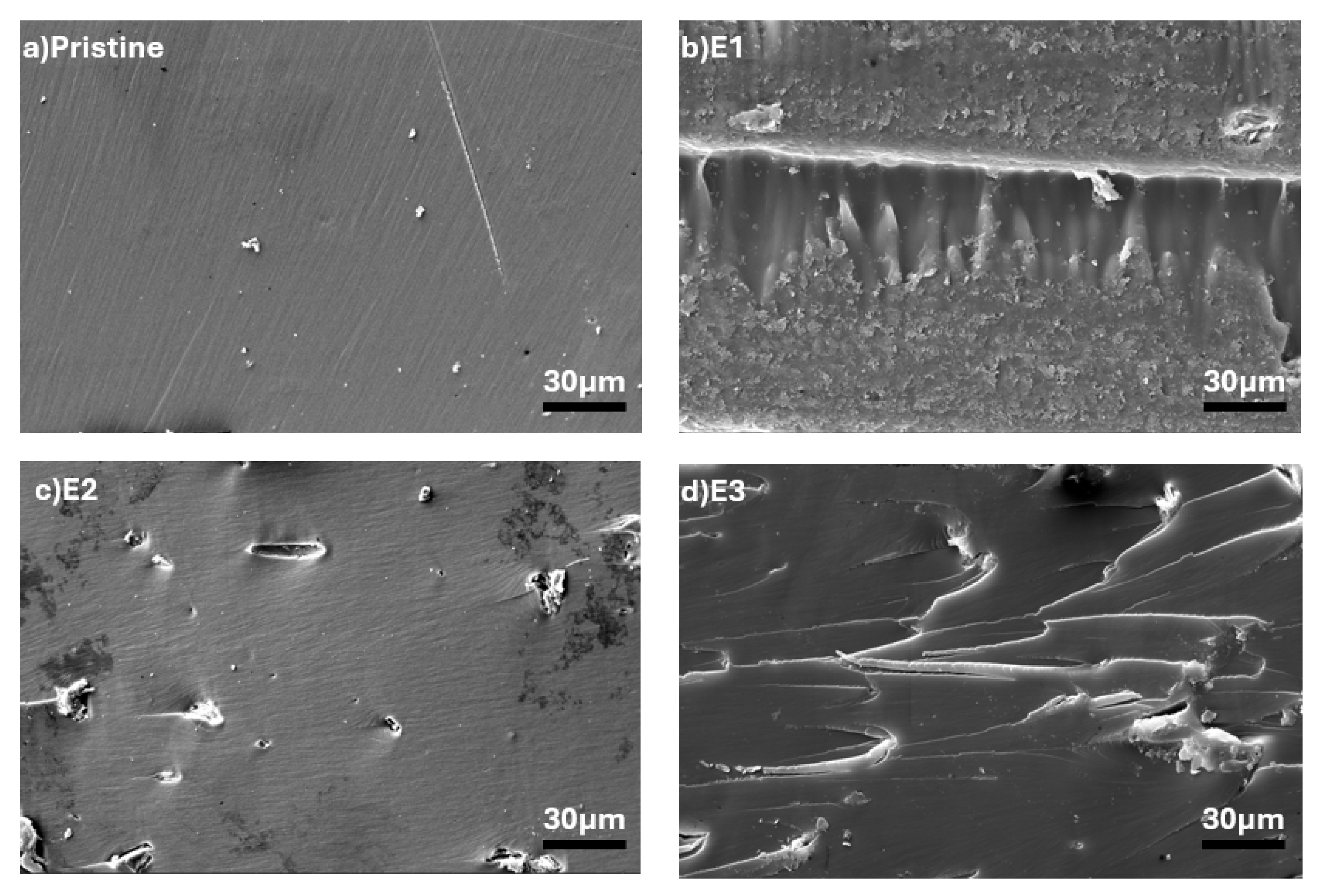 Figure 5 presents a comprehensive morphological analysis of ASW-reinforced epoxy composites across different loading concentrations (E1, E2, and E3), providing crucial insights into the fiber–matrix interfacial characteristics and dispersion quality. At the lowest loading level E1, the SEM images demonstrate relatively good fiber dispersion within the epoxy matrix, with individual ASW particles being well-separated and embedded within the continuous polymer phase [42]. As the ASW content increases to 2 wt% (E2), the SEM analysis reveals a more complex microstructural arrangement with increased fiber–fiber interactions and the beginning of localized clustering [43]. At the highest loading level (E3), the SEM micrographs reveal significant changes in the composite microstructure, including increased fiber clustering and the formation of fiber-rich regions [44].