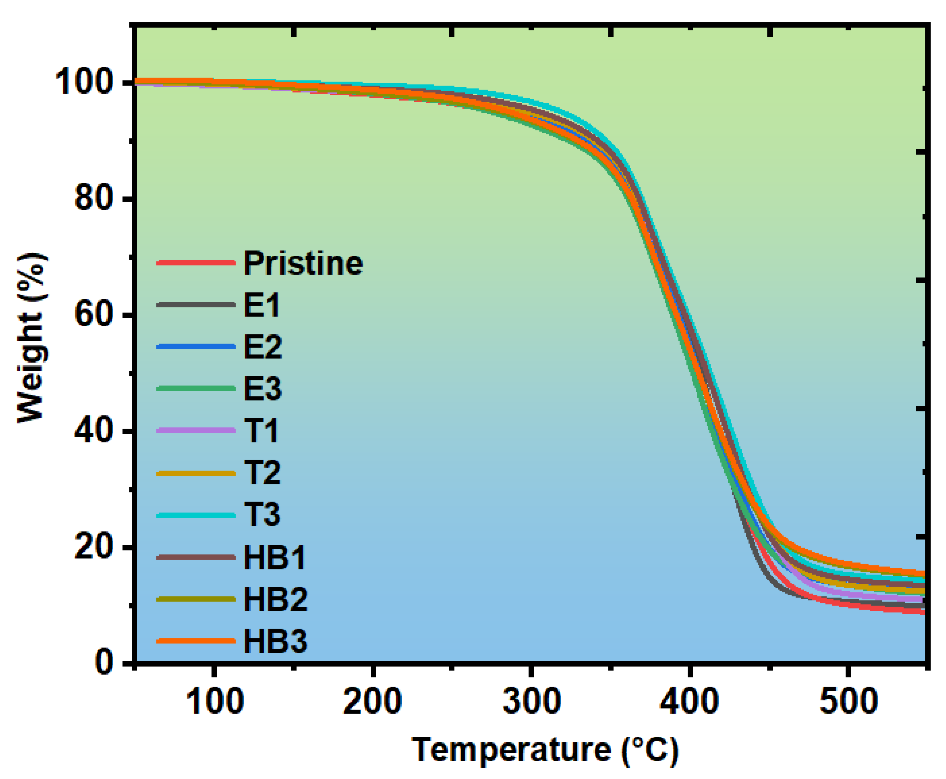 Figure 8. TGA curves of pristine (cured epoxy) and reinforced composites.